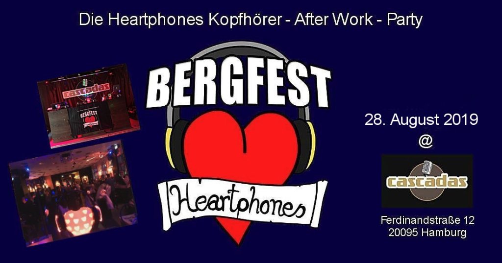 Nach bald 2 Jahren Pause veranstalten wir in der kommenden Woche erstmalig wieder unsere After Work-Party, das Heartphones Bergfest! Wir sind total gespannt, ob ihr uns auch in die Innenstadt, in das Cascadas (Ferdinandstraße, zwischen Kunsthalle, Alster & Hauptbahnhof) folgt. Wir starten am Mittwoch dem 03. April um 19:00 Uhr und machen pünktlich um Mitternacht Feierabend. Der Eintritt beträgt 5,-€. Wir freuen uns auf euch! Hier noch die Facebook-VA.